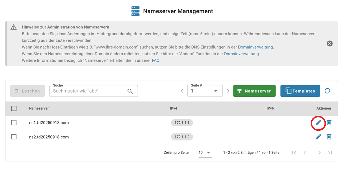 2. Suchen Sie nach dem Nameserver, den Sie ändern möchten, und klicken Sie auf "Ändern" Symbol: