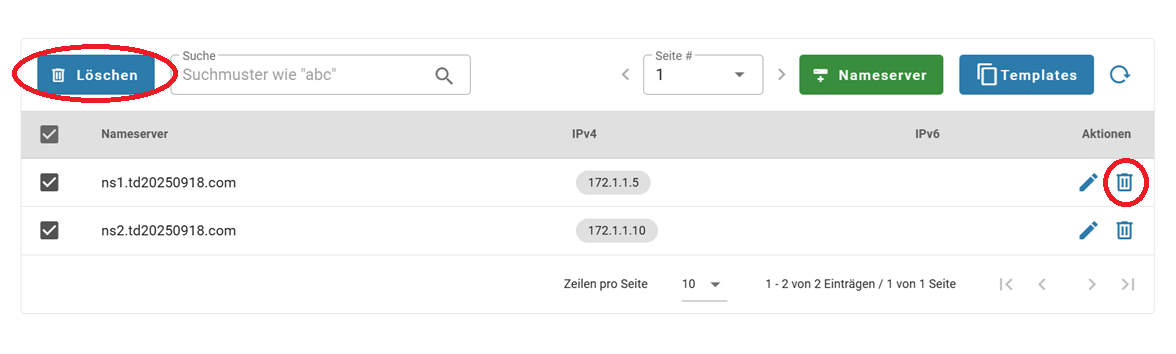 2. Klicken Sie entweder auf das Symbol „Löschen“ neben dem Nameserver, den Sie löschen möchten, oder wählen Sie mehrere aus und klicken Sie auf die Schaltfläche „Löschen“: