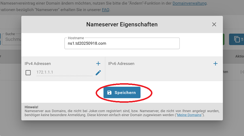 Bitte beachten Sie: Das Anlegen von Nameservern (z.B. das Registrieren eines Hostnamens mit einer IP-Adresse, um einen Nameserver zu definieren) funktioniert bei Joker.com nur, wenn die für diese Nameserver verwendete Domain ebenfalls eine Joker.com-Domain ist. Diese Einschränkung beruht auf technischen/registrierungsbedingten Einschränkungen.