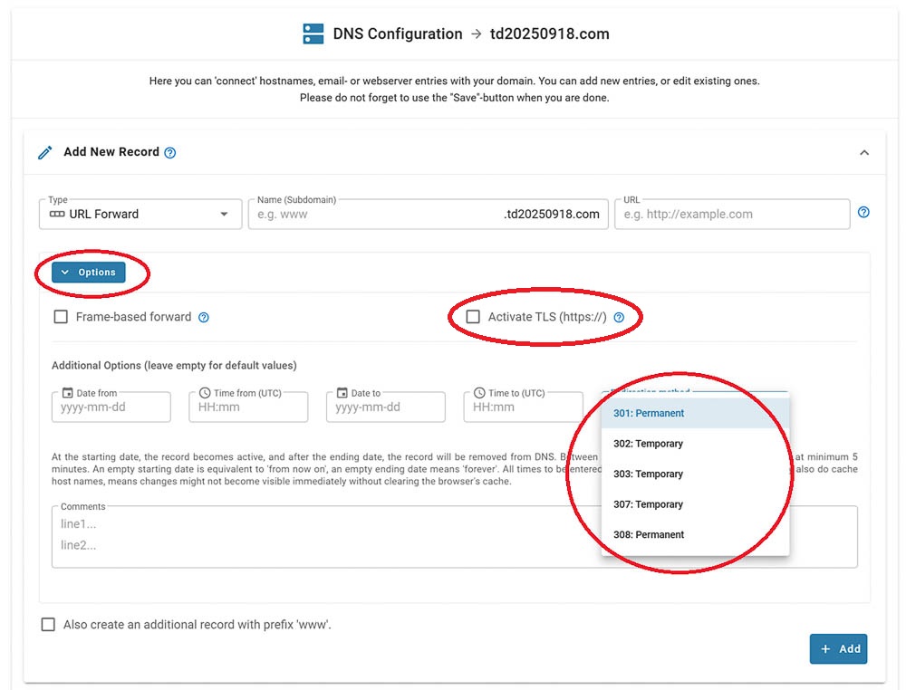 Open the DNS Editor for your domain → configure URL Forwarding → click "Options" → choose your preferred redirect method: