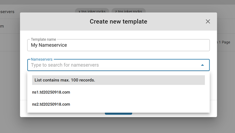 3. In the pop-up menu, you can create a template using your own, registered at Joker.com, nameservers, by choosing them from the list: