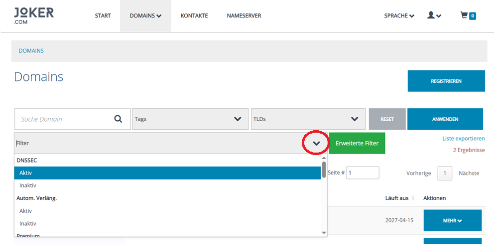 Sie können Domains jetzt nach folgenden Kriterien filtern:
